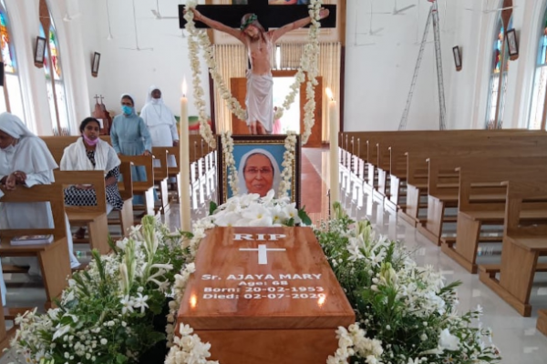 阿加雅是圣母无玷圣心方济会德里省会的修女,该修会位于印度北部,而其修会的公墓位于印度南部的喀拉拉邦。因该修女是感染新冠去世,德里政府不允许修会将其尸体直接运至喀拉拉邦,也不允许其下葬该市间隔狭小的基督徒公墓。因此,只好将其火化后,将其骨灰运回喀拉拉邦。