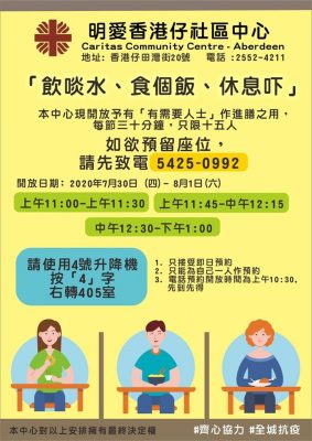 【公教新闻】香港餐饮店7月29日起实施禁止堂食 明爱开放7个中心供预约用膳