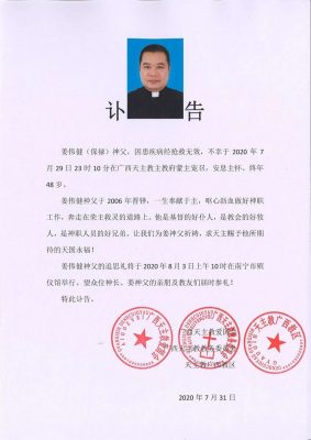 7月31日,广西教区发表讣告,广西教区姜伟健(保禄)神父,因患疾病经抢救无效,不幸于2020年7月29日23时10分在广西天主教主教府蒙主宠召,安息主怀,终年48岁。