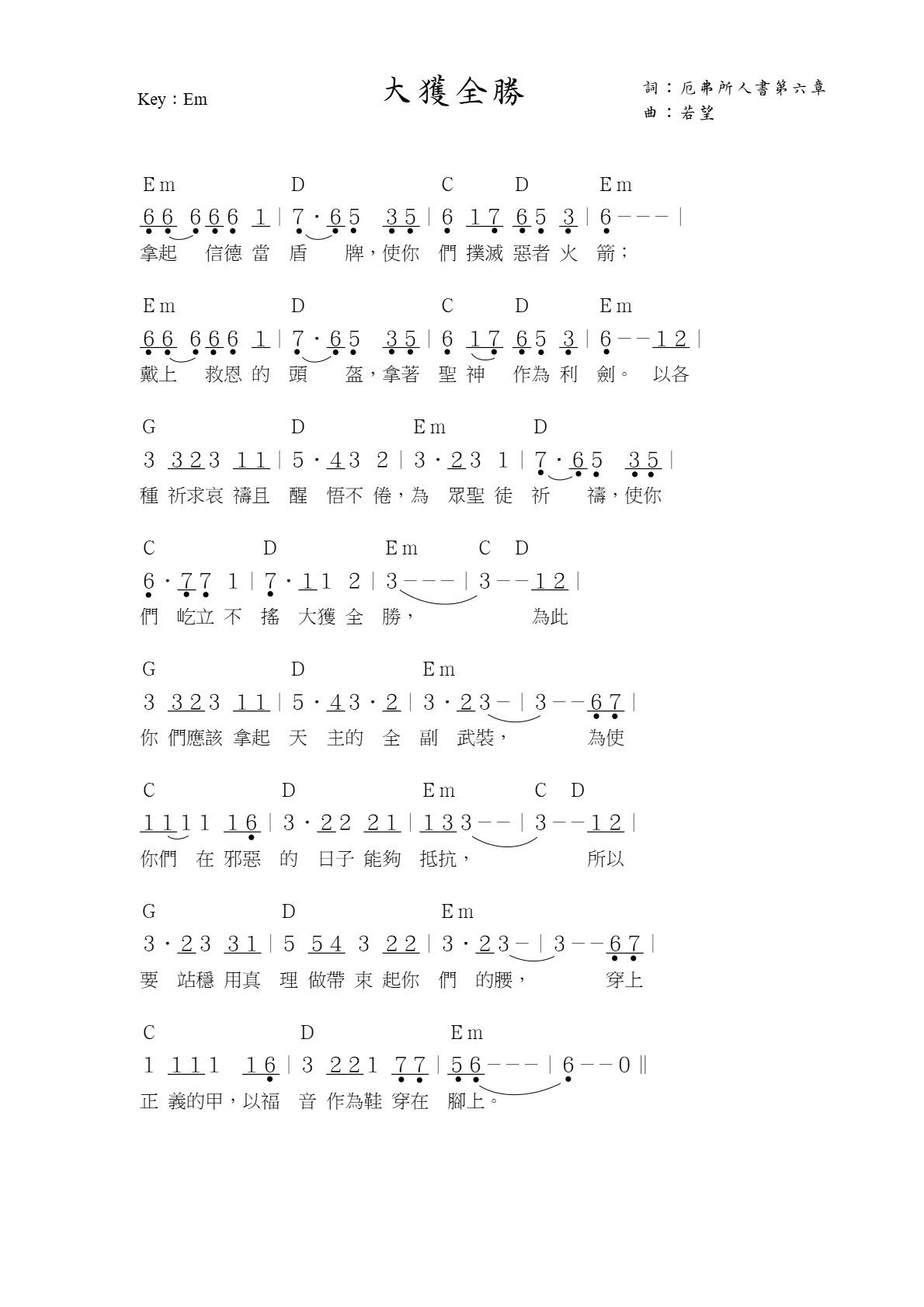 《大获全胜》:一首以新约圣保禄宗徒致厄弗所人书第6章13至18节作为歌词创作的歌曲,有音乐的节奏和旋律的配合真具有教导、训悔和整装待发上战场的气势,提醒天主的儿女为世间正义的使者,面对的是一场场属灵的争战,只有配戴天主的装备,才能大获全胜,是一首鼓舞人心和坚强信德的优秀作品,唯歌曲演唱的诠释和编曲还可以更加强,但值得鼓励。