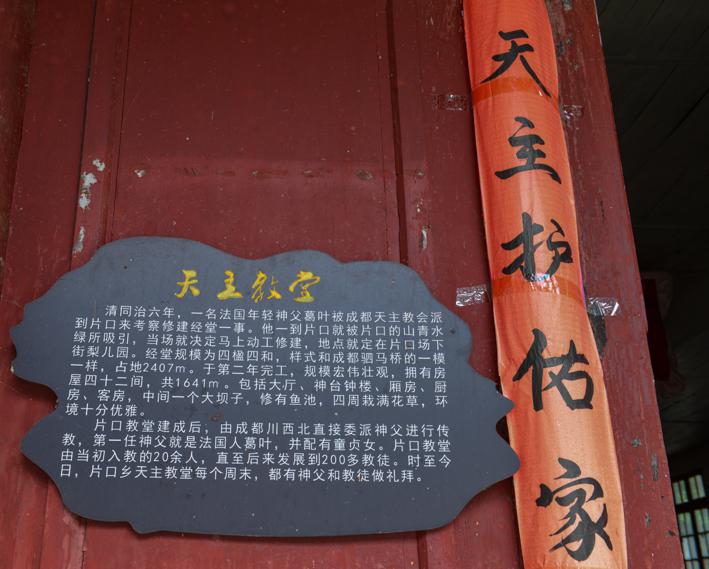 教堂位于小街拐弯下坡的里手,堂前既是街道也是一片小广场,三四辆汽车停放在教堂前。教堂对面是一排铺面,时有人出入。教堂虽然不大,却非常精致,一排羌族人建筑的气息,让人一见,就从心里喜欢。教堂门帘的右边悬挂着,这座教堂的历史简介。