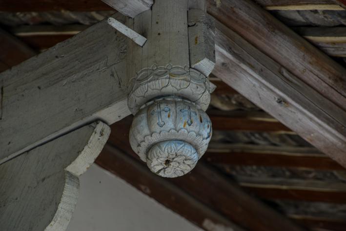 教堂全为木质结构,有木柱和木梁搭建而成,完全是中国羌族人传统的木制搭建工艺,廊檐的椽头刻有十字架,教堂外的屋檐高高的翘起,十分精致美观,教堂顶部有一六角亭,上面有一公鸡造型,这是多年来教会所有的信仰标志,预示人们要悔改、醒悟和坚持信仰。这起源伯多禄在鸡叫前背主的故事,因此,公鸡在教会内就有了“警醒”的寓意。9世纪时,教宗尼古拉斯甚至要求每一个教堂尖顶上都应有一个公鸡的形象,正是基于这种传统,迄今欧洲许多城市的教堂、塔楼、市政厅的尖顶上都有装饰成公鸡形象的风向标。