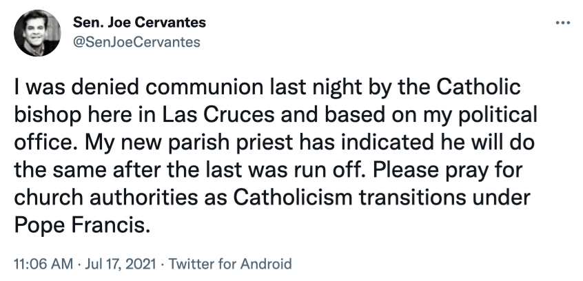 7月17日,美国新墨西哥州参议员塞万提斯(Joe Cervantes)在社交媒体上表示,由于政治原因,他在前一晚的弥撒中被拒绝领受圣体。对此,他所在的拉斯克鲁塞斯(Las Cruces)教区回应说,教区曾私下提醒过他,由于他顽固地赞成一项支持堕胎的法案,他不应在弥撒中前去领受圣体。美国CNA网在7月19日的一篇文章中对此事进行了详细报道,下面我们就跟随这篇文章来一起了解一下。