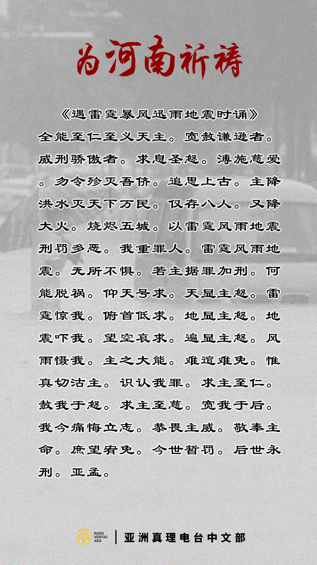在此,壹明邀请大家为河南的受灾群众及救援工作祈祷。文末特附上《遇雷霆暴风迅雨地震时诵》一文(图片),供大家参考。大家也可以为上述意向献上玫瑰经或慈悲串经。