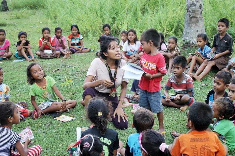 甘榜基金会的教学中心没有教室,也没有办公室,所有教学活动都在海滩边、学生的家门前、田地里或是在一棵大树下举行。与此同时,教学中心的员工也是不固定的,这些志愿者来自印尼各地岛屿甚至来自海外,他们都有着自己的全职工作,例如:医生、警察、教师、军人、护士、银行职员、公务员等等。