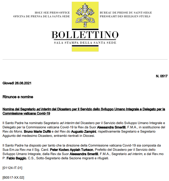 这位“临时”秘书长正是从今年3月24日起,担任该部会副秘书长的斯梅里利(Alessandra Smerilli)修女。据圣座新闻室8月26日发布的公告称,斯梅里利修女获临时任命是因为该部会秘书长杜菲(Bruno Marie Duffé)蒙席和副秘书长赞皮尼(Augusto Zampini)神父均将返回自己的教区。同时,教宗亦任命斯梅里利修女与该部会部长图尔克森(Peter Kodwo Appiah Turkson)枢机及该部会移民与难民事务处副秘书巴乔(Fabio Baggio)神父一道,成为梵蒂冈应对新冠疫情委员会管理团队的成员。
