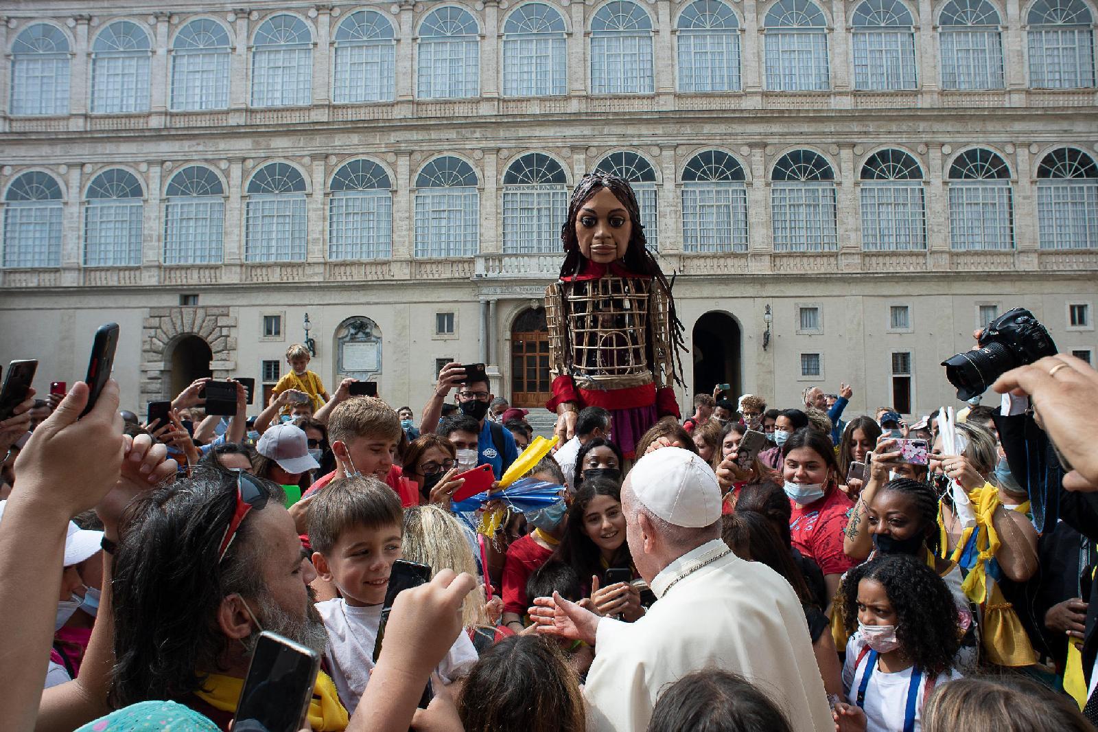 罗马时间9月10日上午,正在进行朝圣之旅的巨型人偶“艾莫”(Amal,寓意希望)来到了梵蒂冈圣伯多禄广场,随后,进入圣达玛索庭院。“艾莫”高3.5米,代表了一名从叙利亚-土耳其边境逃往英国、寻找母亲的少女,它象征着在世界许多国家中,因战争和贫穷而被迫离乡背井的数百万名未成年人。“艾莫”于不久前从叙利亚边境出发,将穿越八个国家,最终抵达英国。