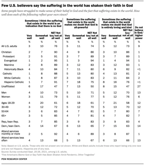 在所有受访者中,只有不到15%的人认为,世界上的苦难让他们怀疑“神”的存在、全能或者仁慈。皮尤研究中心的此项调查发现,这种因痛苦而怀疑“神”的人,在年轻人、民主人士和无宗教信仰的美国人中更为普遍。