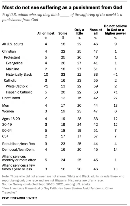 略多于一半的受访者认为,“神”允许人类受苦是因为祂有着一项更大的计划。受访者中持这一观点的人大多为福音派新教徒。