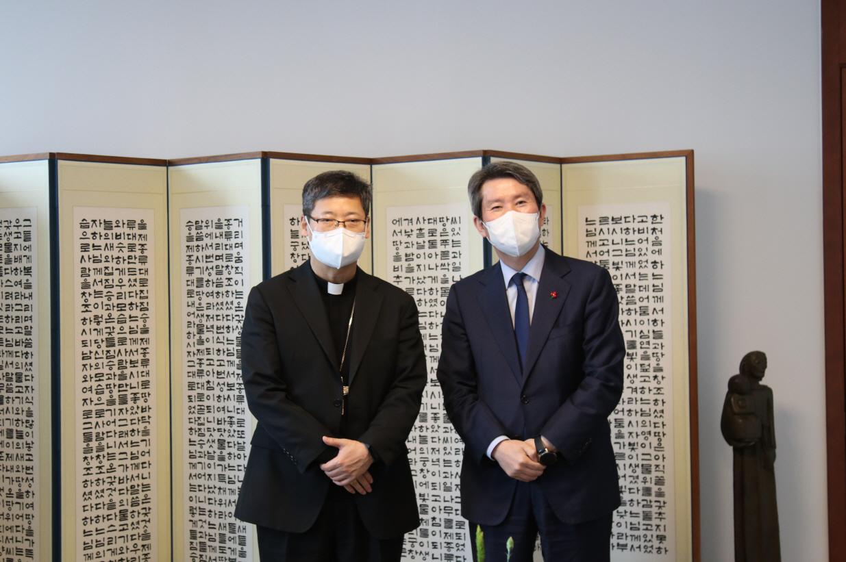 近日,韩国首尔总教区郑淳泽总主教在其主教公署与韩国统一部部长李仁荣会晤,重申了韩国天主教会推动朝鲜半岛和平、修好与统一的承诺。