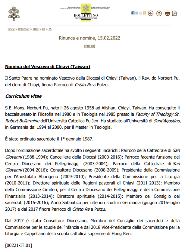 以下为台湾地区主教团翻译自圣座新闻室公告的浦英雄候任主教的履历: