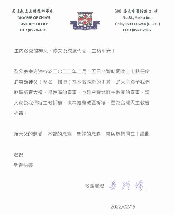 祈愿新主教的到来能为嘉义教区这个总主教的摇篮注入新活力,使该教区的天主子民得到更加妥善的牧养。也让我们为浦英雄候任主教、为嘉义教区和台湾天主教会祈祷!