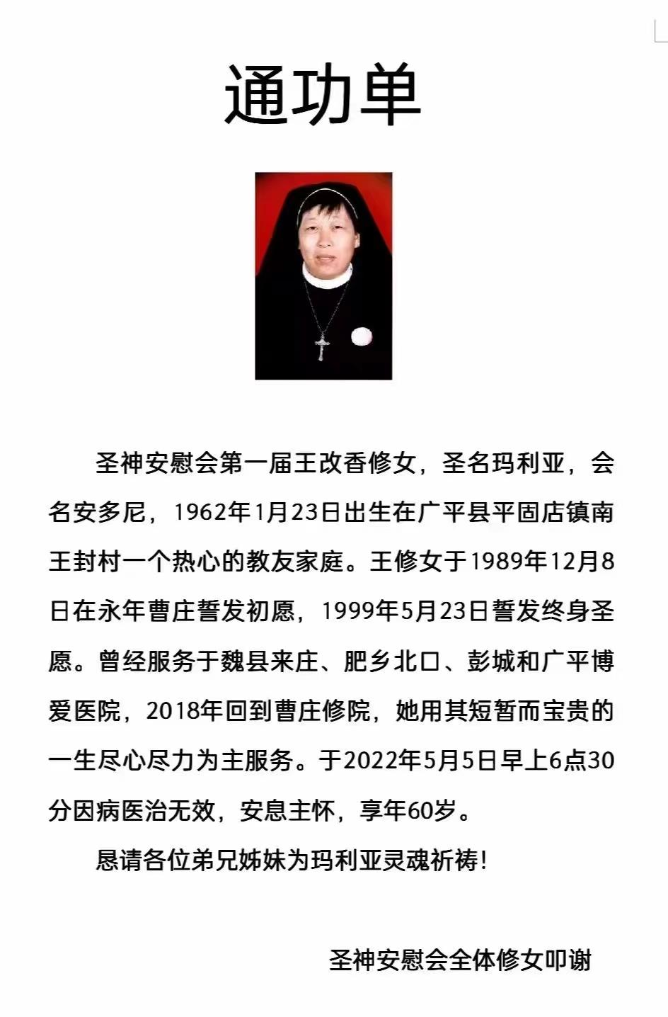 邯郸教区圣神安慰会王改香修女,圣名玛利亚,于2022年5月5日早晨蒙主宠召,安息主怀,享年60岁。请众信友,为彼代祷。愿天主怜其灵魂,赏其早日升天,与诸神圣欢聚于天庭!