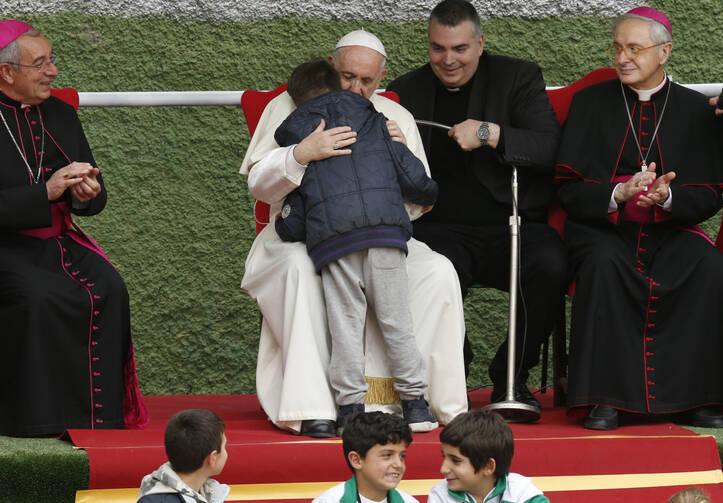 只顾着掩面哭泣的小艾玛,几乎是被萨皮恩扎神父半推半抱地,送上了教宗所在的绿色小讲台。教宗先拥抱了艾玛,并让艾玛靠在他的肩头,在他耳边说出问题。两人低声交谈了一会儿之后,艾玛返回到了自己的座位。