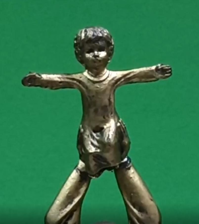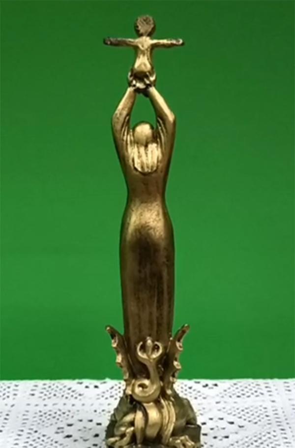 圣婴耶稣:在原来的作品当中,圣婴耶稣是挺胸直视,双臂平直地伸展。这既象征着圣子耶稣在受难时伸开双手,以战胜死亡显示复活的全能,同时也向世界展示了祂对世人的深爱与祝福。同时,当我们从远方看的话,张开双臂的圣子呈现的是一个十字架形。圣母高举十字架(耶稣)战胜了魔鬼(毒龙)。再从圣婴耶稣的身体比例上来看,小耶稣虽是圣婴的一个形象,准确地说应称之为幼儿。但是祂的身体比例却和普通儿童不尽相同。雕像的作者在这里是仿效了教会初期拜占庭艺术中圣婴有着和成人一样的比例的这一做法,适当地拉长了圣婴的身材。这样做,为的是当圣婴伸开双臂时就好似形成了一个“十字架”的形状。