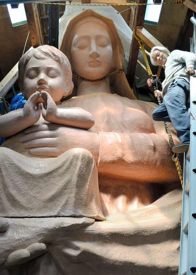 他先是创作了一座50公分高的“圣母抱子”雕像,并将其寄送给了时任教宗若望保禄二世,同时附上了一封表达雕刻者感受和想法的信函。亲松英治后来收到回信,教宗在信中祝福了他的生活和工作。而教宗的此番祝福激发了他制作更大雕像的热忱。亲松英治的雕刻作品从50公分,到后来的2.5米,再到6米,最后达到如今的9.5米——光是它的基座就有3米高,2.5米宽。