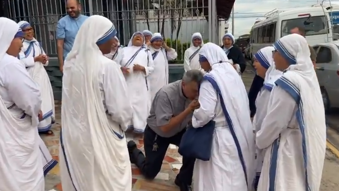 莫拉主教在脸书上发布了一段视频。视频中,他逐一问候了修女们;而当他来到修女团体的长上面前时,他单膝跪地,亲吻了这位修女的手。提拉兰-利韦里亚教区解释说,主教的举动是对仁爱传教女修会团体长上尊敬的标记,也是愿意“听候修女们‘差遣’,并为修女们服务”的标记。