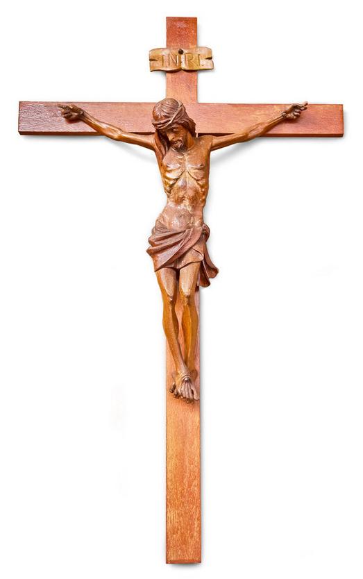 1、“拉丁十字架”(Latin Cross),又称为“罗马十字架”,是天主教会里所使用的最常见的纵长十字架。它的特点就是:纵臂(竖)比横臂(横)长出一倍(竖长横短),而且横臂位于纵臂中段以上的位置。通常基督徒相信曾经耶稣基督就是在这种十字架上受难的。我们经常说的“苦像”,就是这种十字架,上面带有耶稣被钉的雕像。在苦像的上端有一个牌子,牌上有“INRI”四个字母,这是拉丁文“Jesus Nazarenus Rex Iudeorum”的缩写,意思是“纳匝肋人耶稣,犹太人的君王”。根据《若望福音》记载,耶稣被判钉十字架时,比拉多写了一个牌子,放在十字架的上端(若19:19)。这在当时是耶稣的罪状牌,而这牌子上的话实际上说明了耶稣的真实身份。
