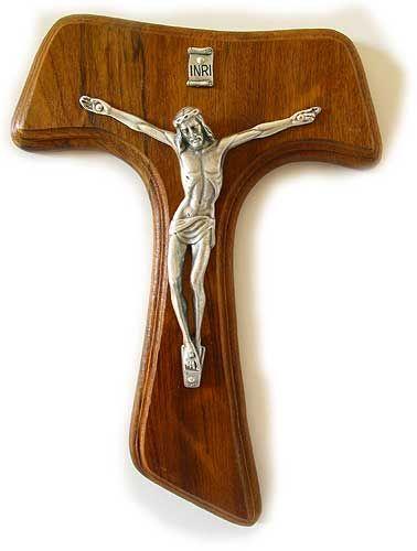 b. 是圣方济会会士所佩戴的十字架。因为它是圣方济各-亚西西的最爱,曾作为自己的徽号。每一次圣方济各在写信落款时都会印上这个标志。为他来说,这个记号不仅体现了贫穷的美德,作为希腊文最后一个字母,也表示了救援,象征着最末和谦小,更表明了每一个人的救恩只能从耶稣的十字架上获得。