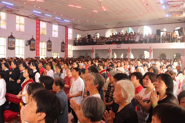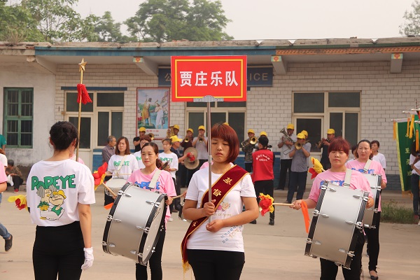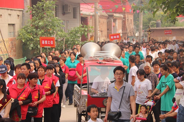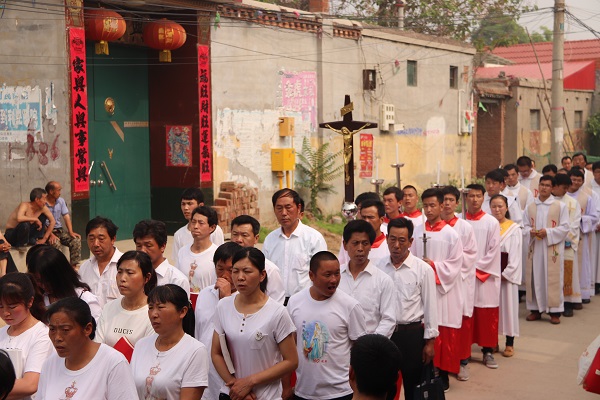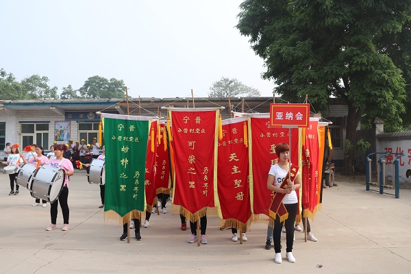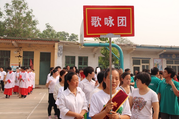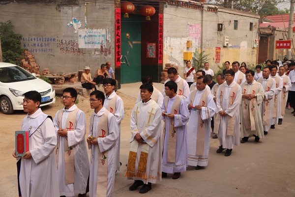 上午 8点30分,以大鼓为前导的方队开始向贾庄圣堂进发,其后分别是圣母祷文方队、军乐队、儿童团、爱德福传方队、基督之侣团体、歌咏团、辅祭人员和神父以及全体教友。