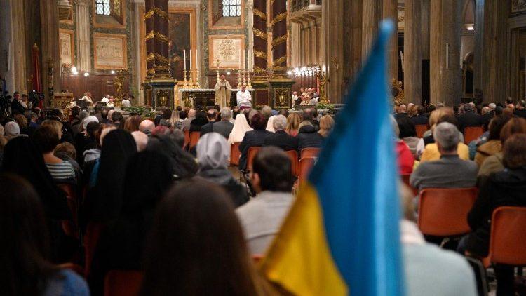 据梵蒂冈新闻网报道,11月17日下午,圣座国务卿帕罗林枢机在罗马市区的圣母大殿主持弥撒,呼吁信友在战争面前不要向失望和泄气的诱惑低头。此台弥撒由乌克兰驻圣座大使馆发起,为纪念乌克兰与圣座建交30周年。有来自约60个国家的大使和代表前来参礼。