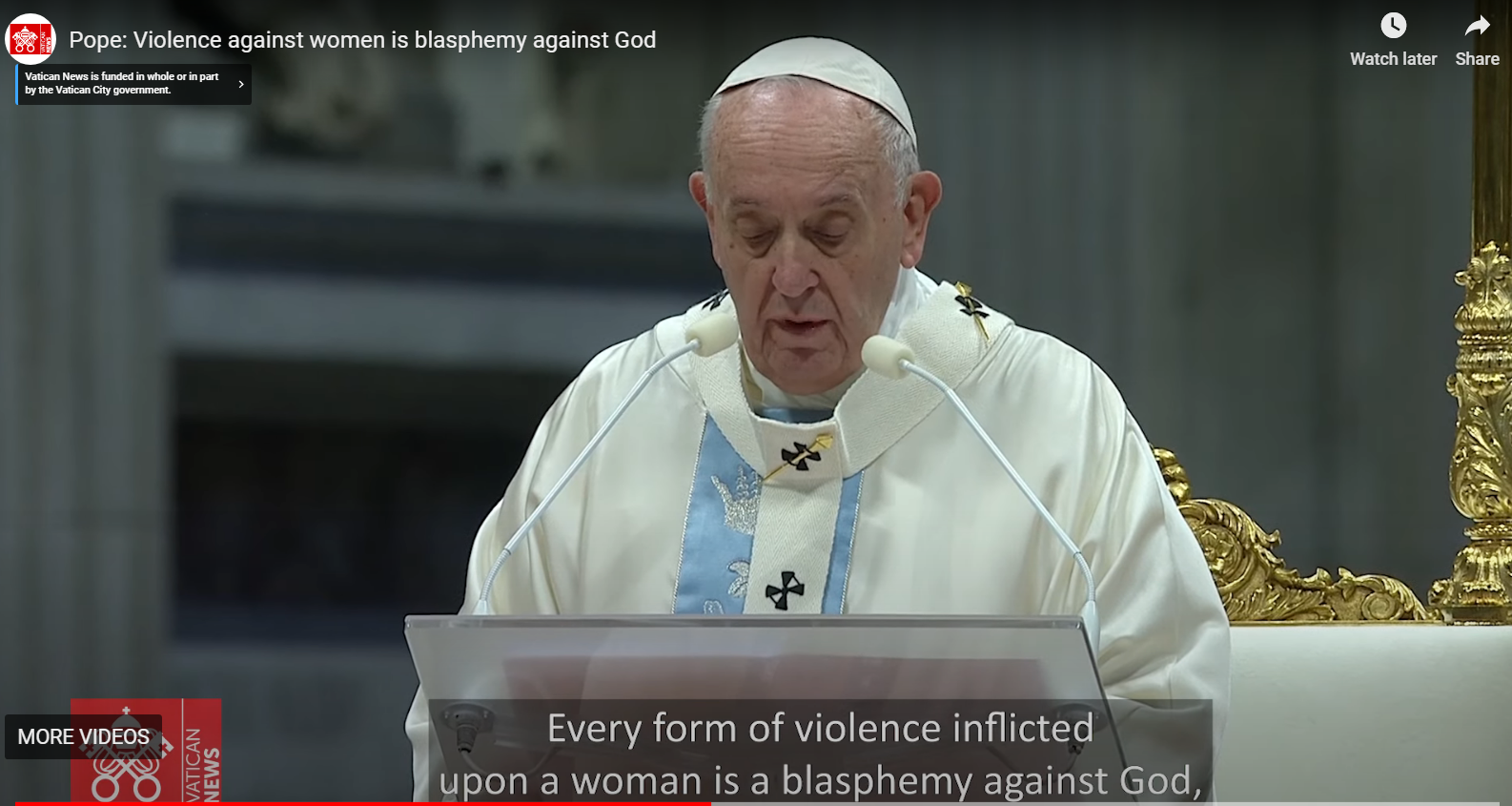 教宗方济各自就任以来,就一直强调尊重女性的重要性,强调对女性或其身体的虐待就是对上天的亵渎。在今年的天主之母节这一天,教宗在新年致辞中呼吁为所有遭受剥削和暴力的女性祈祷,因为她们被用作性工作者,在战争和冲突中被贩卖、遭受攻击、奸污,各种形式上的暴力和歧视。教宗强调,人类的重生始于女性。但是,身为生命之源的女性却不断地受到侮辱、殴打、强奸、被迫卖淫。在她们子宫里孕育的生命也遭到压抑。每一种对妇女的暴力行为都是对那生于女人的天主圣子的亵渎。全人类应当明白,人性的水平就是通过对待妇女的态度来衡量的。