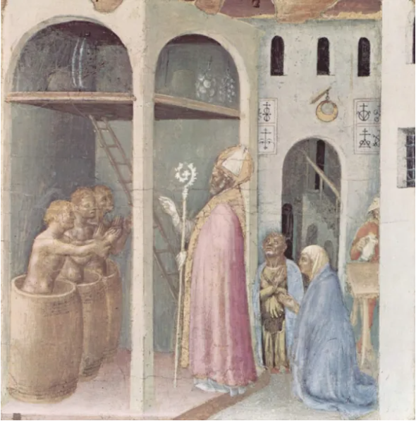 传说在主教管辖的教区发生饥荒期间,三个小男孩被坏人引诱到一家肉店,被杀后腌制在木桶里,打算制作成“火腿”出售。这件事被善良的主教得知,他不仅使死去孩子起死回生,还使他们免于悲惨的命运。在中世纪,这个故事成为尼各老艺术形象的主题。对于此故事的描绘,还使他享有保护儿童的声誉。
