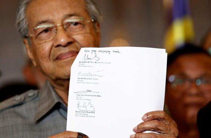 马来西亚新当选的总理马哈蒂尔·本·穆罕默德,昨天在皇家宫廷会议期间获得吉兰丹国王穆罕默德五世的批准后宣布了内阁。星期一,新政府正式宣誓就职仪式,将在马来西亚主权官邸-国家宫殿举行仪式。92岁的马哈蒂尔宣布了五名内阁部长的名字,其中包括财政部的林冠英,内政部的穆希丁·亚辛(Muhyiddin Yassin)和国防部的穆罕默德·萨布(Mohammad Sabu)。旺阿兹莎(Wan Azizah Wan Ismail) 是前马哈蒂尔竞争对手安华(Anwar Ibrahim)的妻子是新任副总理。马哈蒂尔说,一旦他被选为议会议员或参议员补充选举,他将在「一至两年内」将政府移交给安华。(亚洲新闻/通讯社)