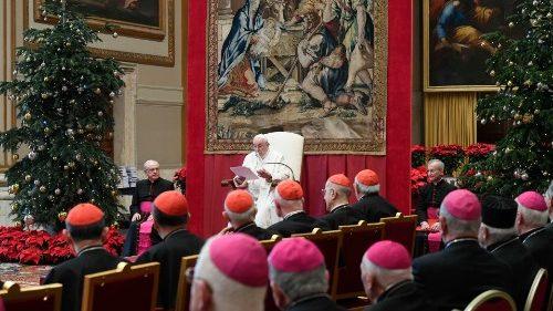据梵蒂冈新闻网报道,12月22日上午,教宗方济各在宗座大楼的降福大厅接见了圣座各部会的枢机、主教和成员,依照传统与他们互贺圣诞佳节。教宗说:“在回顾这重要的一年时,在任何其他事情之前,我们先要感谢主的所有祝福;然而我们希望在这些祝福中,包括我们的皈依。”