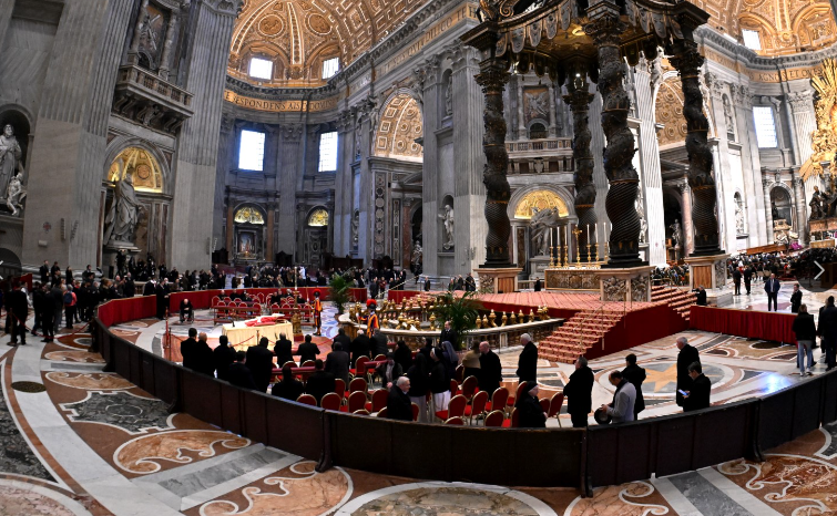 到了圣伯多禄大殿,抬柩人慢慢地把他的遗体抬进教堂,沿着中间的过道,放在祭坛前的一个平台上——第265任教宗的遗体几乎正躺在第一位教宗圣伯多禄(St. Peter)墓的正上方。