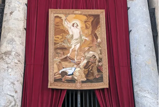 这件纺织品是梵蒂冈艺术收藏品的一部分,悬挂在教宗公寓。由朱塞佩·弗利(Giuseppe Folli)根据安东尼·凡·戴克( Anthony van Dyck )的《复活》布面油画而形成。本笃十六世可能也很喜欢这幅画,画中复活的耶稣高举双臂胜利地走出坟墓。