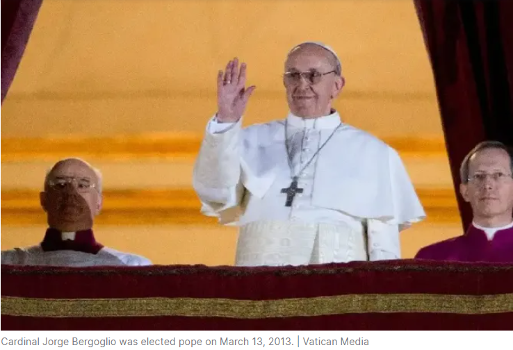 2013年3月13日,教宗本笃十六世辞职后,枢机主教本名豪尔赫·贝尔戈里奥(Jorge Bergoglio)在教宗选举会议的第二天被选为教宗。方济各是第一位拉丁美洲教宗,也是教会历史上第一位担任教宗的耶稣会士。