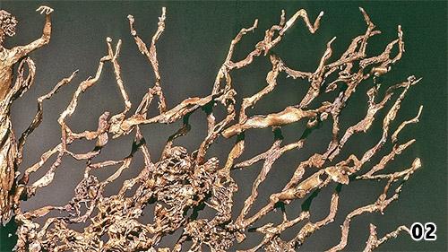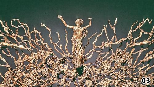 这座21米宽、7米高、3米深的复活铜雕是一把敞开的扇子,与巨型珊瑚的形象相近,耶稣基督像的周围则是橄榄枝,藉着光线所赋予的生机与变化,描绘了耶稣基督从昔日的革责玛尼庄园——即今世的核弹坑中升天及复活。