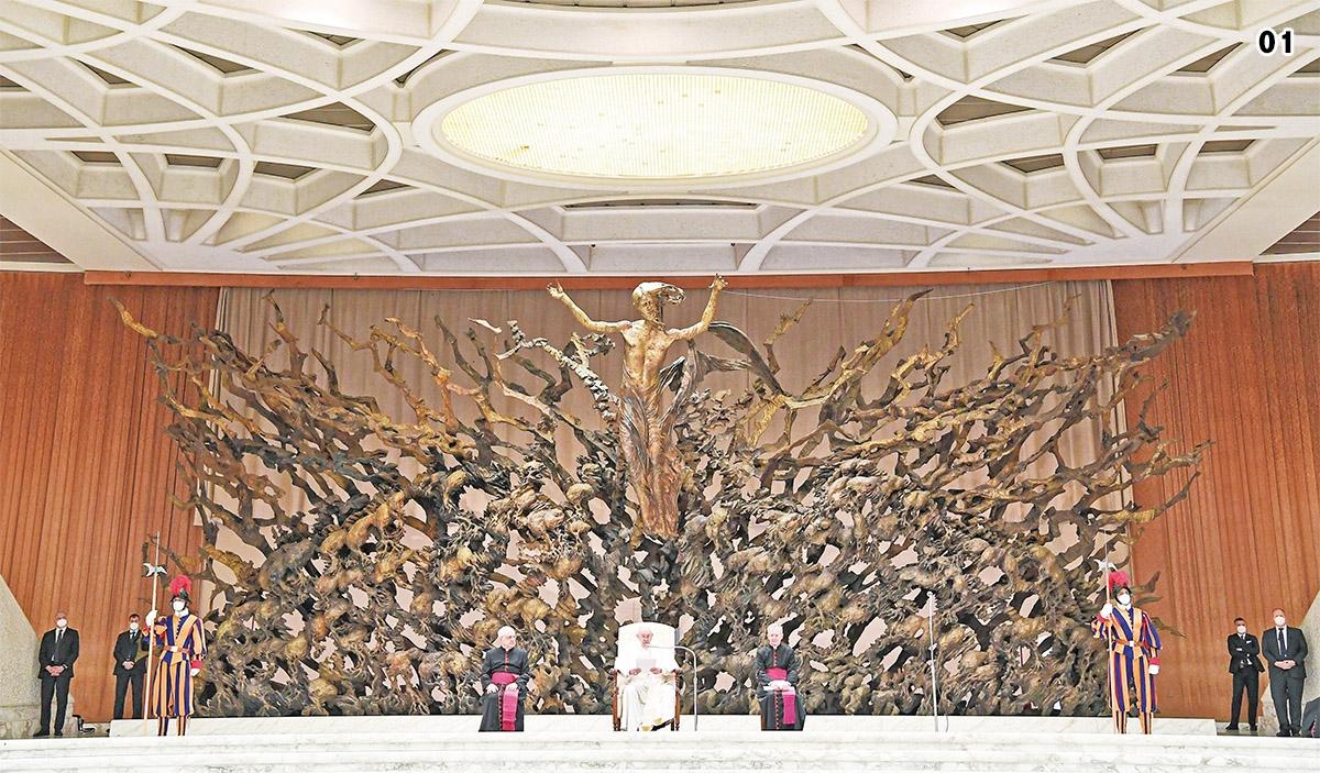 据香港公教报报道,在梵蒂冈保禄六世大厅教宗座位的后方,有一座巨大而瞩目的铜制雕塑:正中央上方是耶稣基督像,下方及两旁的支架上面有许多乍看像骷髅头的球体,有点像灾难场面。这座名为“复活”的铜雕,是意大利艺术家法齐尼(Pericle Fazzini,1913-1987)于1977年完成的作品,描绘耶稣基督从核爆灾难当中走出来。