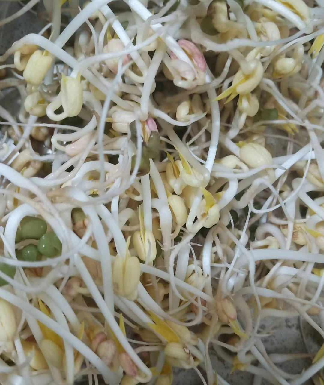 第二天黄昏时,我本想熬些米粥犒劳一下劳累的自己。当揭开锅盖时,我被震惊了!两颗绿豆只是在锅里一天的时间竟然已经张开了小口,貌似有一点点的小苗芽冒出来。原来,前天刷锅时仅存下的几滴水滋润了它们的“内心”,更给了它们呆在原地,长出新生命的机会。惊喜之余,我把这两个“小宝贝”捧在手心里细细端详了一会,便拿到水管那里冲洗一下,补充一些水分,然后放回原地,让它继续生长。又过了一天,这两个“小家伙”果然不负众望,嫩芽已经变得更长,极力地伸展着。看到这一幕,我想起这几天的福音,我突然顿悟了什么:“种子撒在好地里自然结实……”哦,原来如此……我内心无比得喜乐,好像明白了什么……于是兴奋地拿出一些绿豆,准备“撒种子”,这是我人生第一次尝试长绿豆芽!