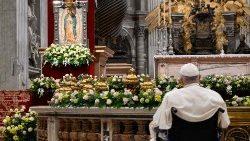 据梵蒂冈新闻网报道,12月12日瓜达卢佩圣母庆日傍晚,教宗方济各在圣伯多禄大殿用西班牙语主持了弥撒圣祭,共祭的枢机、主教和司铎超过300人,约3000名信友参礼。