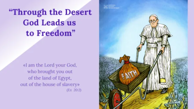 第一张海报围绕着“天主引导我们穿过沙漠走向自由”这一主题信息设计,海报上,方济各推着一辆装满标有“信仰”的袋子的手推车,沿着一条布满钉子的沙漠小路行走。莫帕尔在新闻发布会上解释说,这些钉子代表“我们的新旧偶像,我们所有的捆绑和束缚。当我们跟着教宗方济各前行时,他以信仰的力量开辟了道路,障碍就消失了,这条路对所有人来说都是可行的。”