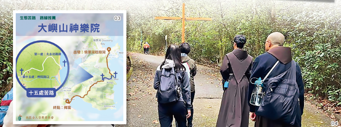 教区全人发展委员会(全委)去年邀请了夏志诚辅理主教重写《生态苦路》,在默想部分加入生态环保的角度。该会最近向教友推荐西贡盐田梓及大屿山神乐院两条山径苦路路线,执行秘书罗佩珊表示,藉此邀请教友走到大自然,一边默想基督受难、死而复活带给人类的救恩,一边欣赏天主创造的海洋、山景,感受受造物之美和天地人的连结,从而反思在生活中对生态的破坏,与大自然修和。