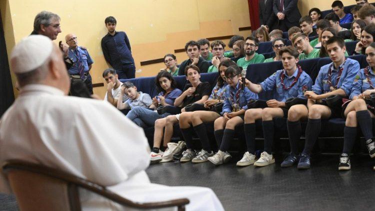 教宗看着眼前这80名青少年,对他们说:“请你们随便提问,勇敢些,不要怕!”于是一问一答的热烈场面便开始了。对于自己的圣召是如何来的这个提问,教宗回复,当他还是个青年,有一次在圣玛窦瞻礼那天去办告解,那个机会使他有了内在的体验。经过许多祈祷,几年后他进了修道院。