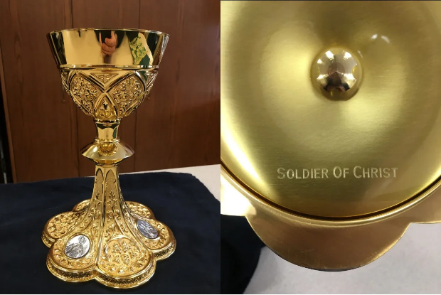 达味神父清楚地记得自己去神学院挑选圣爵的情景。桌子上摆放着四五个圣爵。其中一个圣爵很显眼,因为它最近刚刚翻新过。达味神父回忆道:“它很漂亮,闪闪发光。”通常,当有人向神父赠送圣爵时,会在底座上刻上“纪念”或“感谢”等字样。当他把圣爵翻过来读上面的铭文,他差点把圣爵从手中掉落。底座上写着“基督的战士”。多年后,他仍然感叹天主的奇妙作为,天主以如此独特的方式确认了他的圣召。
