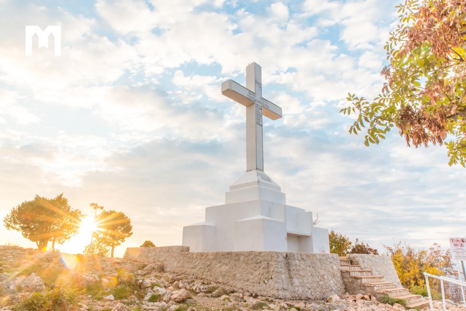 早在1981年有关圣母显现的报道出现之前,默主歌耶的十字架山就一直是该地区朝圣者的目的地。这座10米高的白色混凝土十字架是该教区于1933年为纪念耶稣受难1900周年而建造的,横梁交叉处放置着基督十字架的遗物。这些遗物是罗马教廷此次捐赠的。