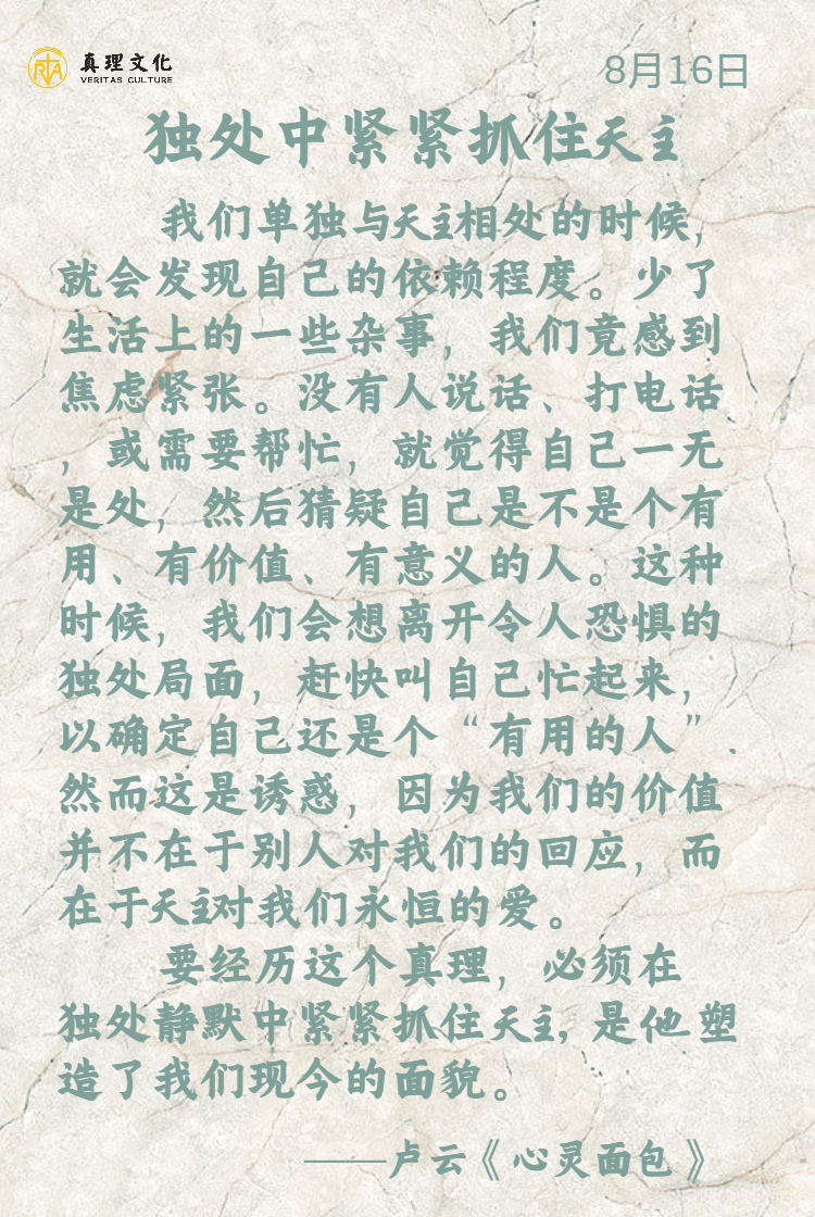 反观我们自己,或身边的朋友,也许都曾经没有履行自己的诺言。也许,当别人失信于自己时,我们的反应会是烦躁、生气、紧张等等。天主在这里给我们的邀请,是不断地活在对祂的信赖中。谨让我们的目光,常注视祂。唯独在祂那里,我们才会获得真正的自由喜乐,才不会因为生活的小事而忧伤失落。