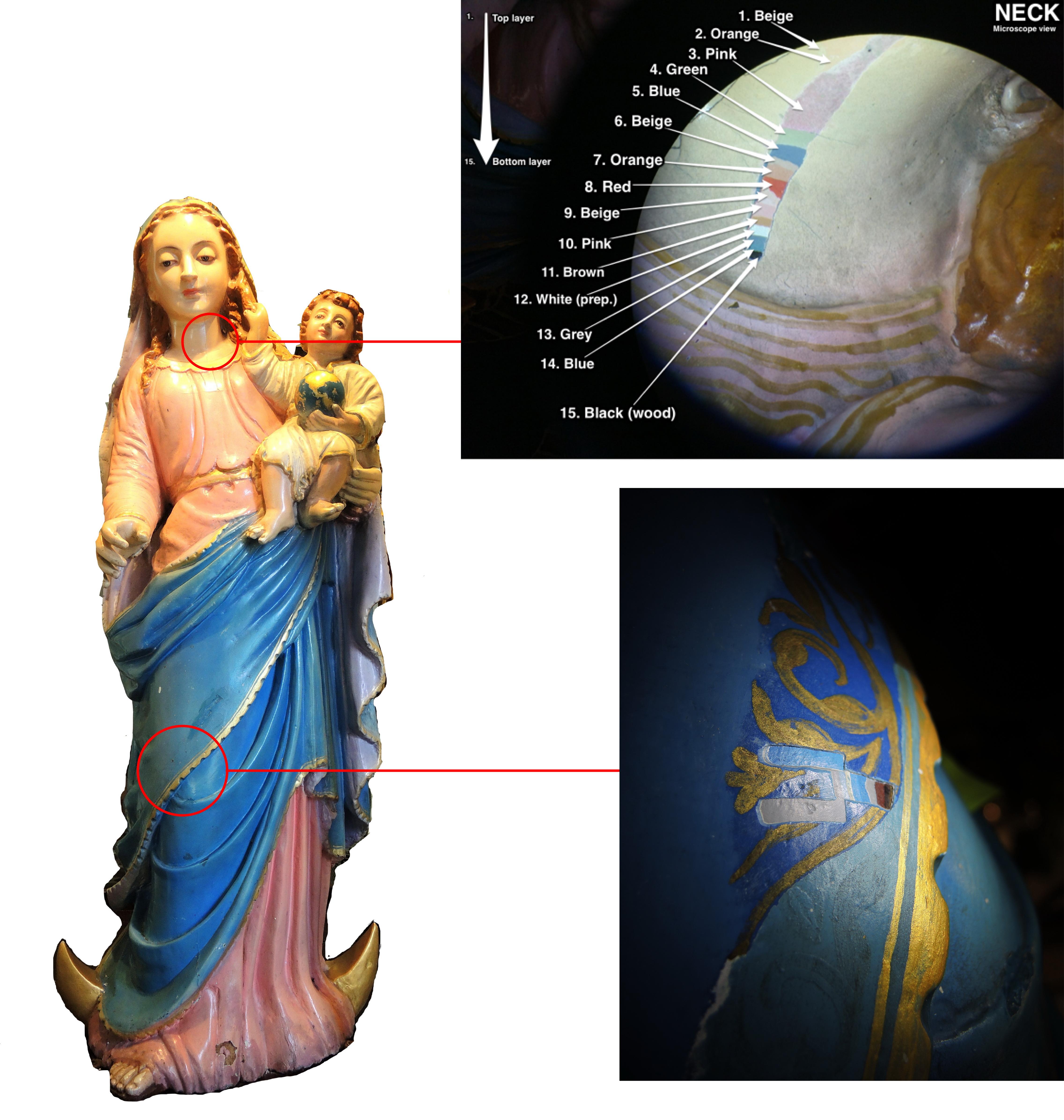 此堂有两个超过300年的重要历史文物。其一是位于祭台前的圣母像。2013年堂区修复圣母像时,X光扫描显示圣母像的表层共有15种不同的色料。