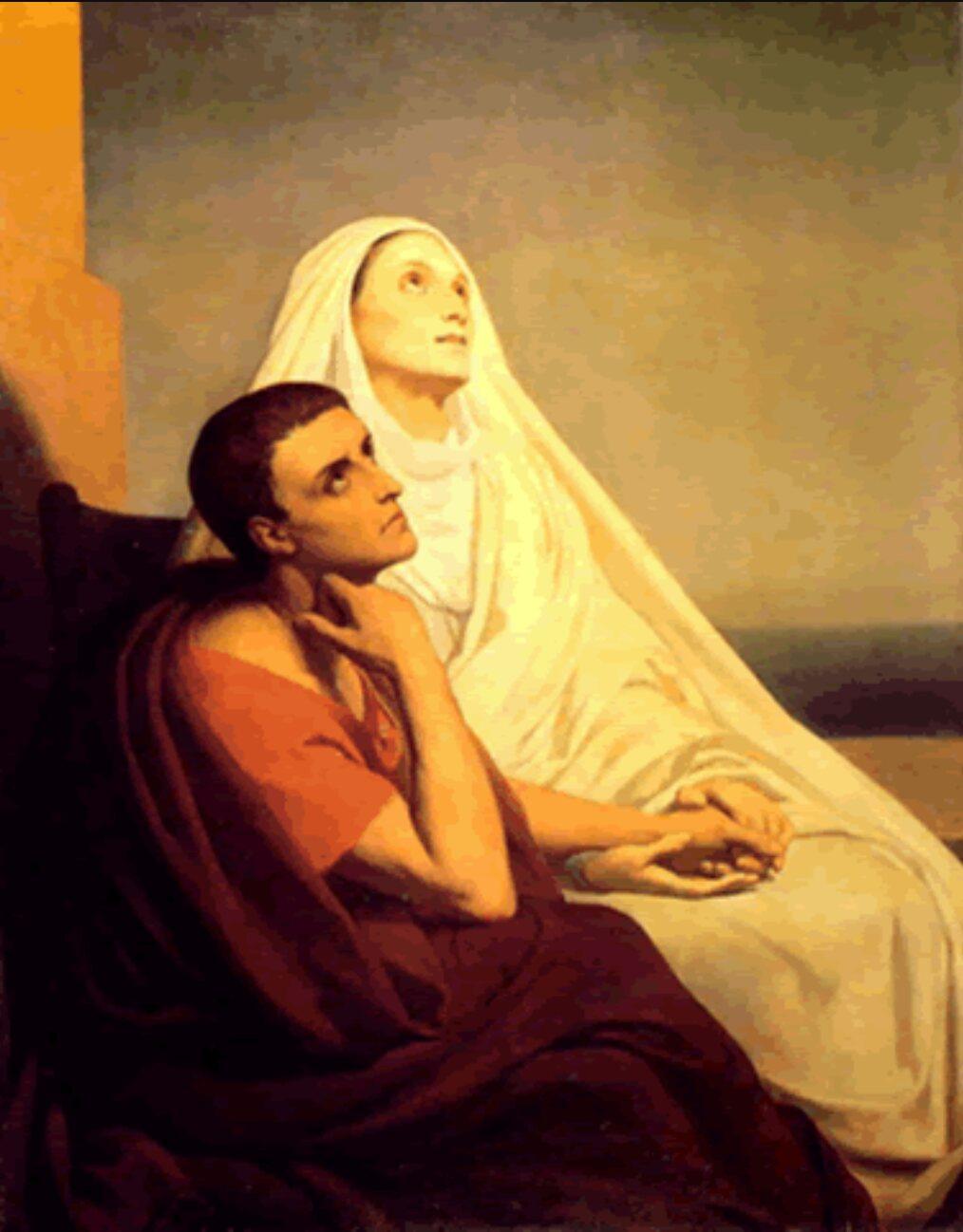 圣莫尼加因儿子的过错而哭泣过无数次,但也多次得到了天主的肯定。圣莫尼加梦见自己为儿子哭泣,一个神视告诉她,儿子仍然和她在一起。圣奥斯定在其自传《忏悔录》中写道:“她所哀叹的是我的灵魂……神视中天使告诉她要平静下来,她在哪儿,我也在哪儿。”