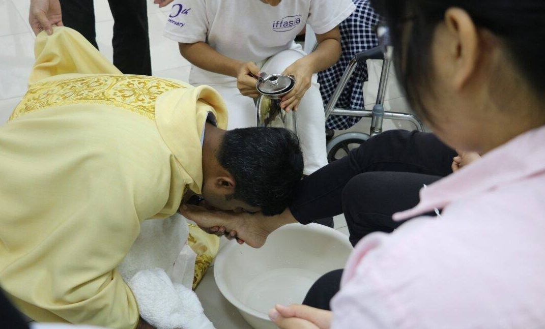 据本台报道,圣周四晚上亚洲真理电台举行了主的晚餐礼仪,主礼安布·塞尔瓦姆神父(Fr. Anbu Selvam)为来自不同背景的人们(包括病人、边缘群体、来自亚洲不同国家的青年以及其他宗教人士)洗脚——象征着基督对所有人的爱与服务的讯息。最后晚餐弥撒之后是朝拜圣体守夜礼。