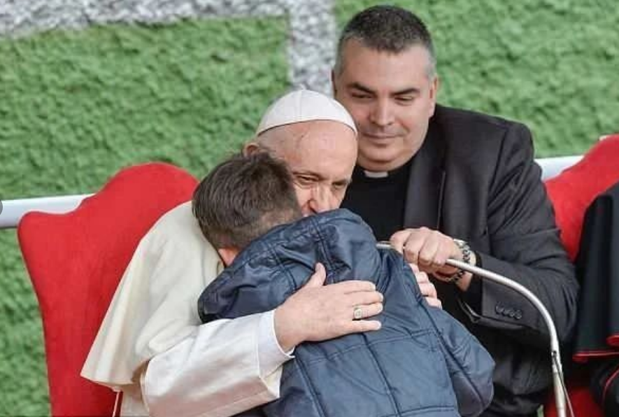 (2018年4月,拥抱并聆听一位担心自己已经去世的“无神论的好爸爸能否升到天堂”的小男孩的问题)