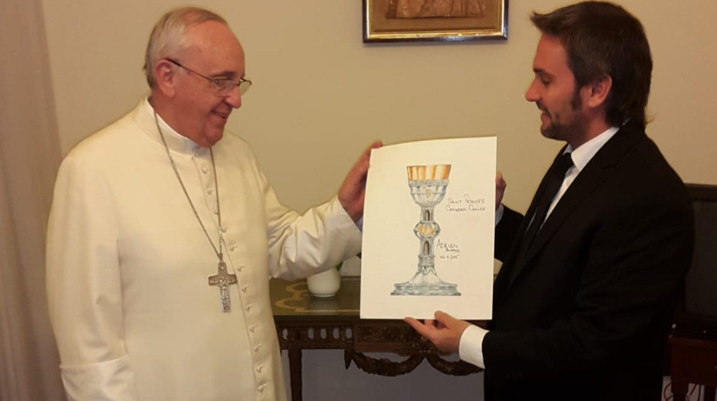 教宗方济各为阿德里安夫妇主持了婚礼,并为他们的孩子方济加和马特奥施洗。这位第七代银匠曾定期与布宜诺斯艾利斯总主教会面,一边享用修女准备的牛奶和饼干,一边探讨神学和艺术。2002年,他们在布宜诺斯艾利斯大教堂修复期间相识,并于2005年共同打造了一个圣爵,并将其赠予当时的教宗本笃十六世。 多年来,双方一直保持着合作。2015年,阿德里安制作了教宗在纽约麦迪逊广场花园主持弥撒时使用的圣杯,并于2022年制作了“和平之战”的奖杯。