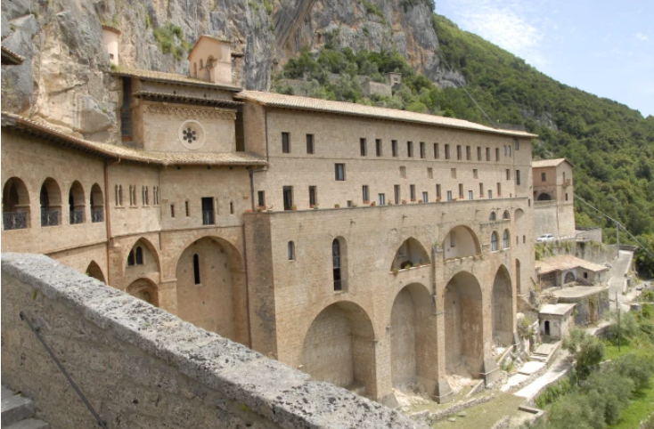 圣本笃修道院坐落在苏比亚科(Subiaco)雄伟的辛布鲁伊尼(Simbruini)山脉峭壁之间,苏比亚科位于阿涅内河谷腹地,距离罗马约一小时车程。修道院也被称为“圣洞”(Sacro Speco)。著名的宗教生活规则正是从这里诞生,并流传了几个世纪,至今仍被世界各地成千上万的修士和修女所遵循。