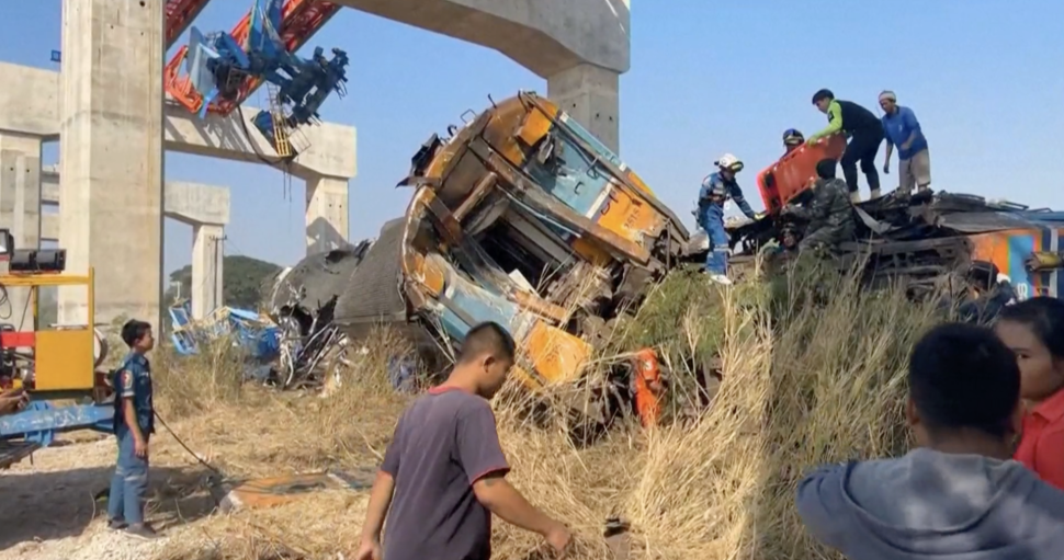 法新社核实的现场画面显示,起重机的残骸倒在巨大的混凝土柱上,下方列车残骸冒出浓烟。救援人员在首都东北部的呵叻府(Nakhon Ratchasima)努力从倾斜的车厢中救出乘客。