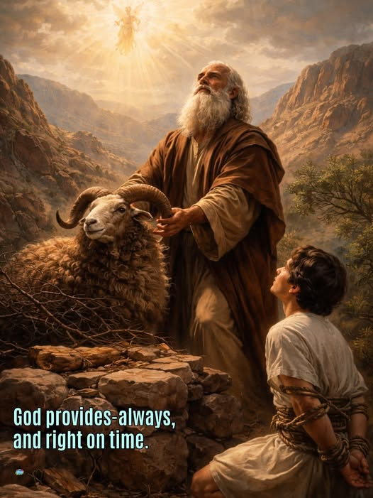 亚巴郎把依撒格捆绑起来,放在祭坛上的木柴上,伸手举刀要宰献自己的儿子。在那一刻,他已经完全交托,上主的使者从天上对他喊说:“亚巴郎!亚巴郎!不可在孩子身上下手,不要伤害他。”亚巴郎举目一看,看见有一只公绵羊,两角缠在灌木中,遂前去取了那只公绵羊,代替自己的儿子,献为全燔祭。于是,亚巴郎给那地方起名叫:“上主自会照料”。